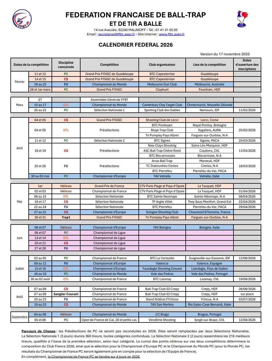 Le calendrier fédéral 2026 a été publié ce jour, 11 novembre 2025.